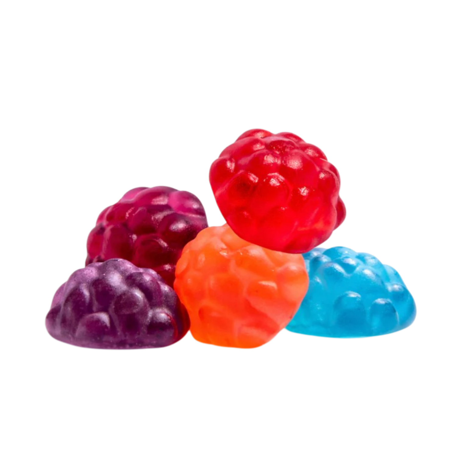 Berry shaped gummies, bursting with five delicious flavors: Cherry, Strawberry, Grape, Blue Raspberry, and Red Raspberry.