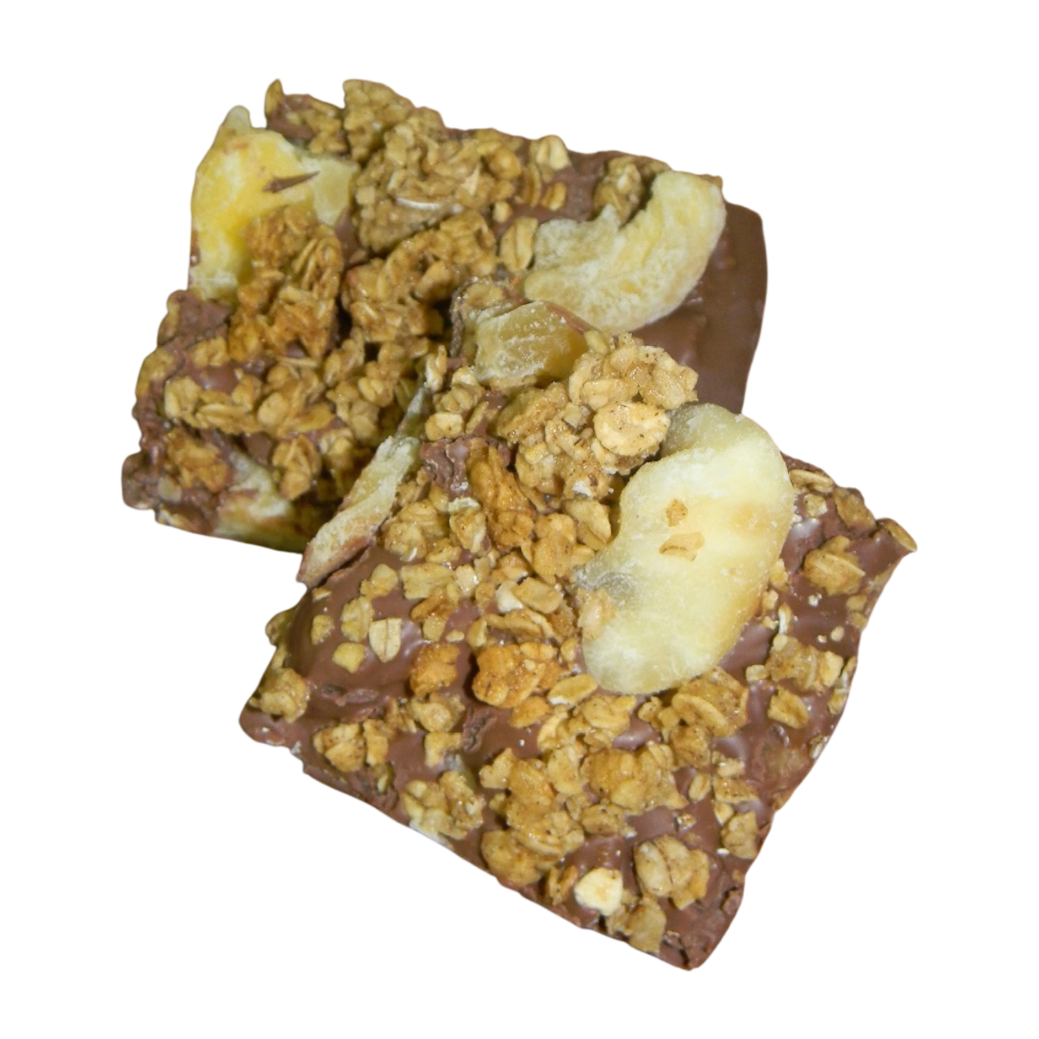Crunchy Honey Crisp Apples mixed into milk chocolate and sprinkled with Honey Crisp Apple Pie Granola.