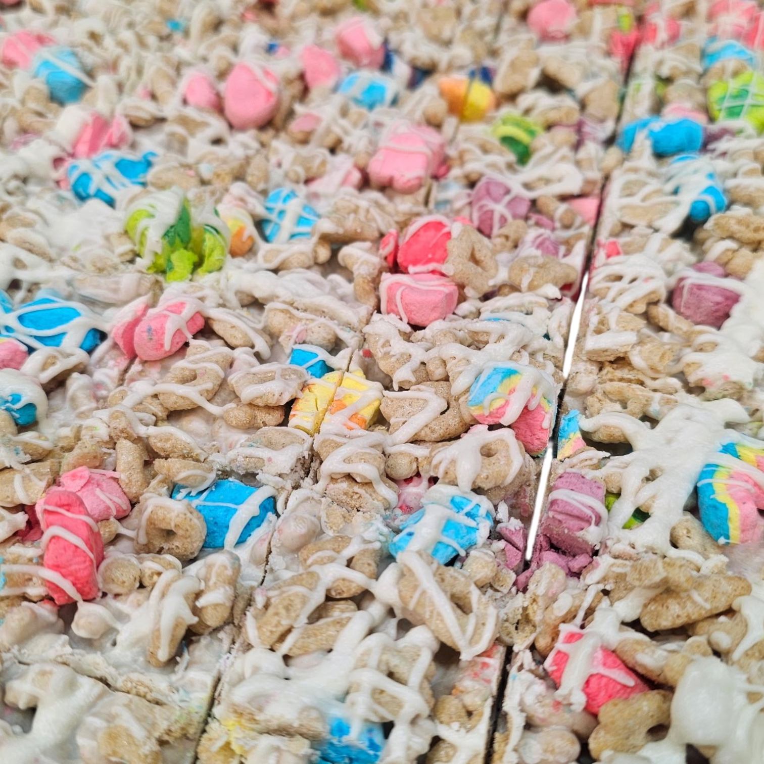 Smooth white chocolate surrounding crispy Lucky Charms cereal.