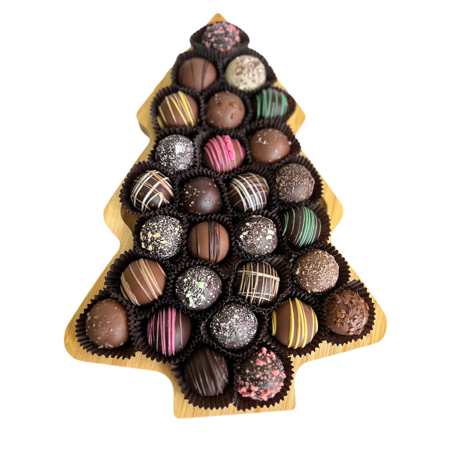 Our rich gourmet truffles carefully placed in a Christmas Tree shaped wooden tray.